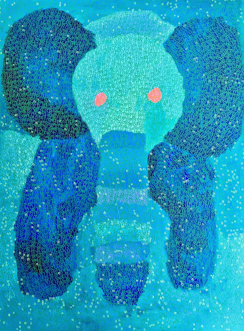 Godwin creates his work in three stages, first laying down a bright base coat, and then painting the subject, usually an animal or plant. When he paints, Godwin uses a complex system of colors and numbers to express how he is feeling. Finally, Godwin uses Japanese paint markers to fill his canvas until every inch is covered with numbers and he has achieved a kaleidoscopic effect that is both beautiful and highly meaningful. Godwin then names each work, producing wonderfully specific titles like, "The tree is having a wonderful day because friends are together '99'" and "The elephant is having an okay day because it feels a bit stiff '55.'"
